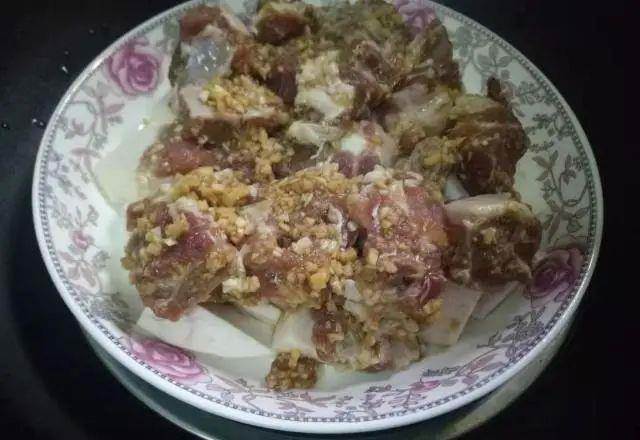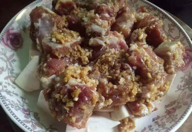 3、準備一個大點的盤子,然后把切好的香芋塊擺入盤中,再將之前腌制好的排骨擺在香芋的上面,把剩下是料汁也一起淋入盤中。(裝香芋我們要用深點的盤子,以免蒸的時候湯汁會溢出來。)
